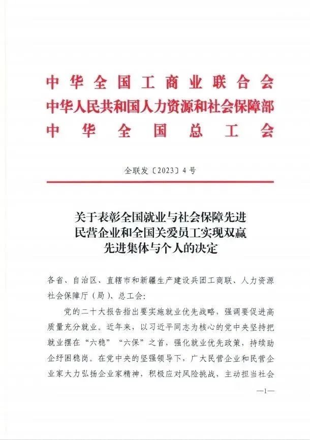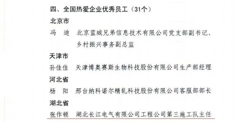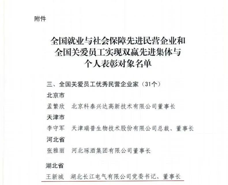 近日,中華全國工商業(yè)聯(lián)合會、中華人民共和國人力資源和社會保障部、中華全國總工會發(fā)布《關(guān)于表彰全國就業(yè)與社會保障先進(jìn)民營企業(yè)和全國關(guān)愛員工實現(xiàn)雙贏先進(jìn)集體與個人的決定》,長江電氣黨委書記、董事長王新城榮獲湖北省唯一“全國關(guān)愛員工優(yōu)秀民營企業(yè)家”稱號,長江電氣員工張作頓榮獲湖北省唯一“全國熱愛企業(yè)優(yōu)秀員工”稱號。